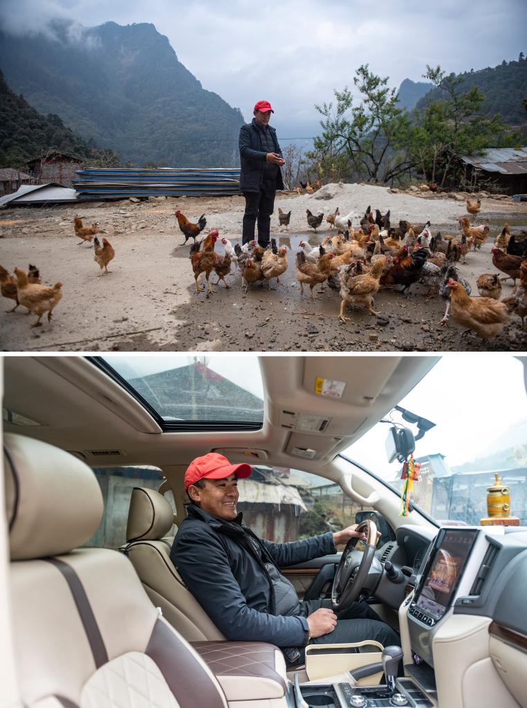 拼版照片:上圖為,陳塘鎮(zhèn)的致富帶頭人拉巴塔杰給養(yǎng)雞場(chǎng)的散養(yǎng)雞喂食;下圖為,拉巴塔杰坐在自己致富后購(gòu)買的越野車內(nèi)(均為11月25日攝)。 新華社記者 孫瑞博 攝
