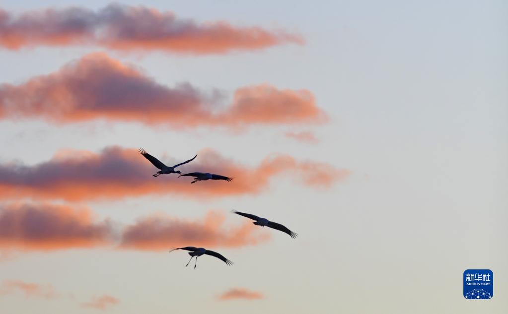 黑頸鶴在拉薩市林周縣黑頸鶴自然保護(hù)區(qū)飛翔(1月8日攝)。新華社記者 張汝鋒 攝