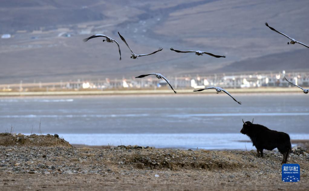 黑頸鶴在拉薩市林周縣虎頭山水庫(kù)飛翔(1月8日攝)。新華社記者 黃豁 攝