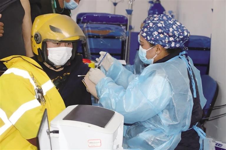 醫(yī)務人員為美團外賣騎手接種第三針新冠疫苗。圖片來自拉薩工會微信公眾號