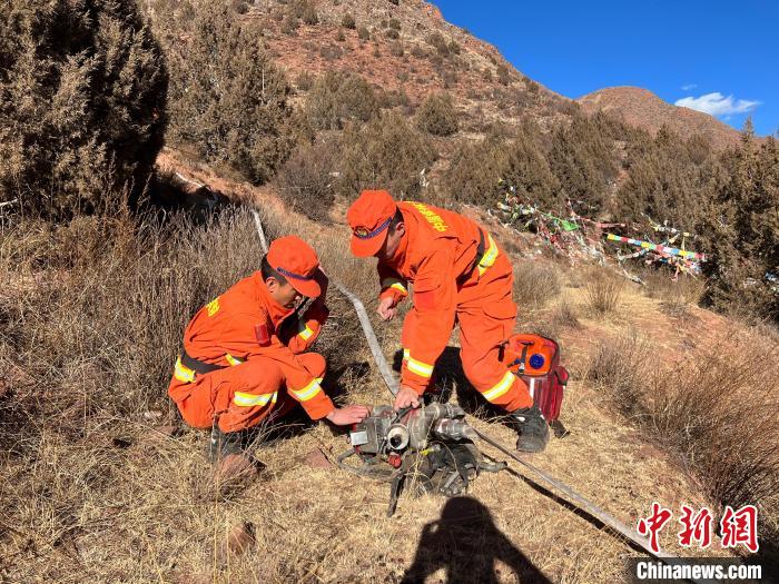 圖為消防指戰(zhàn)員架設(shè)水源地。江達(dá)縣森林消防中隊貢覺駐防分隊 供圖