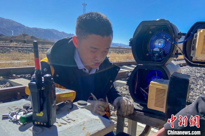 圖為劉興文在拉日鐵路測(cè)試信號(hào)機(jī)電燈電壓?!⊥鮼睚垺z