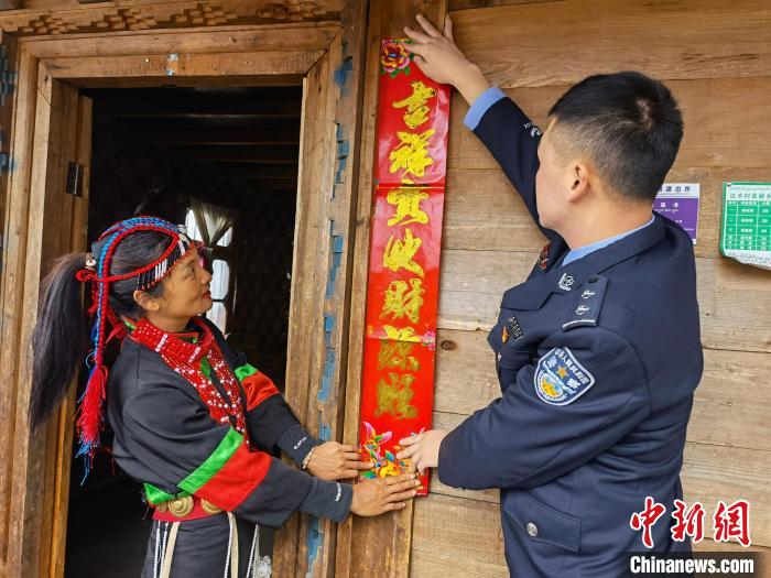 圖為林芝達(dá)木邊境派出所民警幫轄區(qū)民眾貼春聯(lián)。 王濤 攝