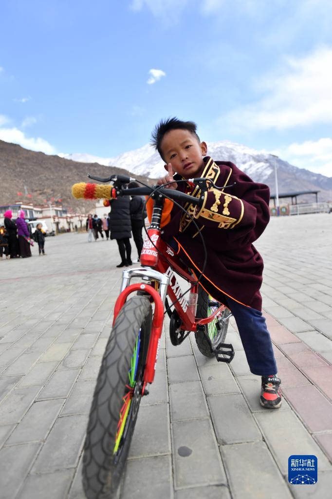 一位搬遷牧民家的孩子在榮瑪高海拔生態(tài)搬遷點(diǎn)騎自行車(chē)玩耍(2月28日攝)。新華社記者 覺(jué)果 攝
