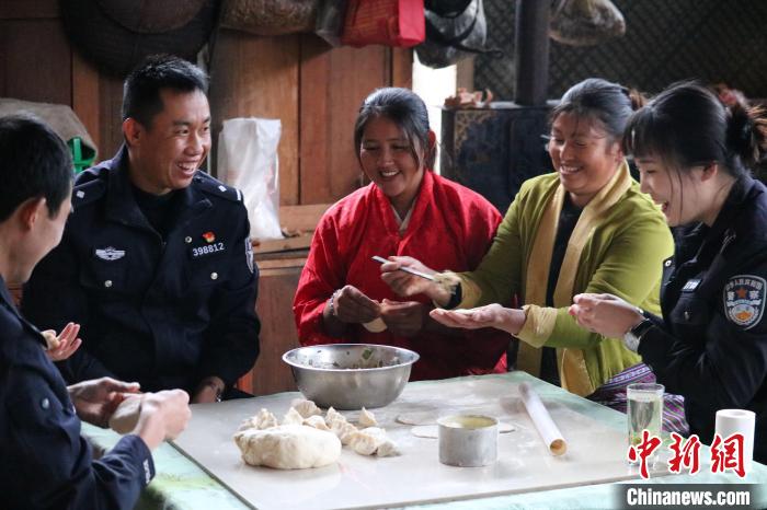 圖為背崩邊境派出所的民警和轄區(qū)民眾一起包餃子。呂恒剛 攝