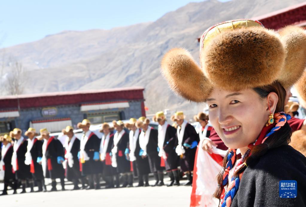 3月3日,西藏山南市貢嘎縣崗堆鎮(zhèn)農民穿著嶄新的氆氌藏裝參加藏歷新年活動。新華社記者 覺果 攝