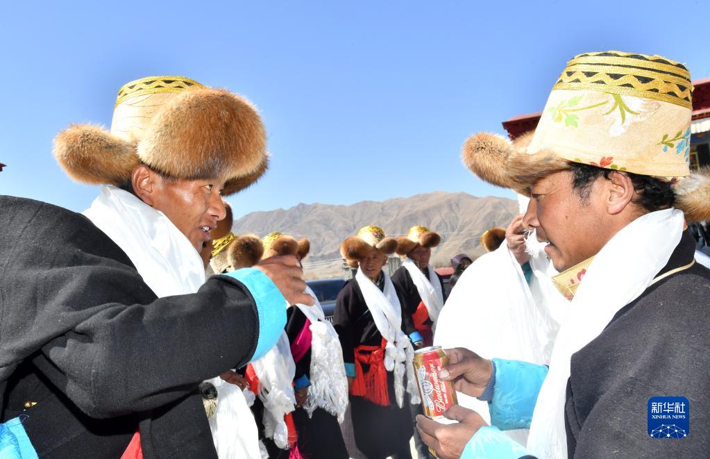 3月3日,西藏山南市貢嘎縣崗堆鎮(zhèn)農民互相敬酒,慶賀藏歷水虎新年。新華社記者 覺果 攝