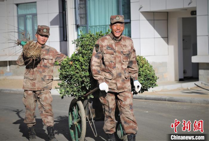 圖為官兵正在搬運(yùn)苗木。王思澳 攝