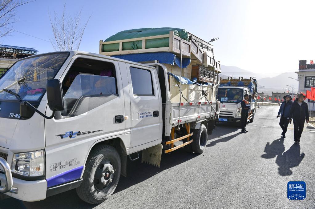 次旺堅(jiān)參(左)將家具搬進(jìn)位于湘河水庫(kù)移民新村的新家(3月27日攝)。新華社記者 張汝鋒 攝