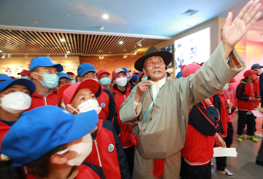 普次仁正在給參觀的學(xué)生進行解說(2022年3月28日攝)。(受訪者供圖)