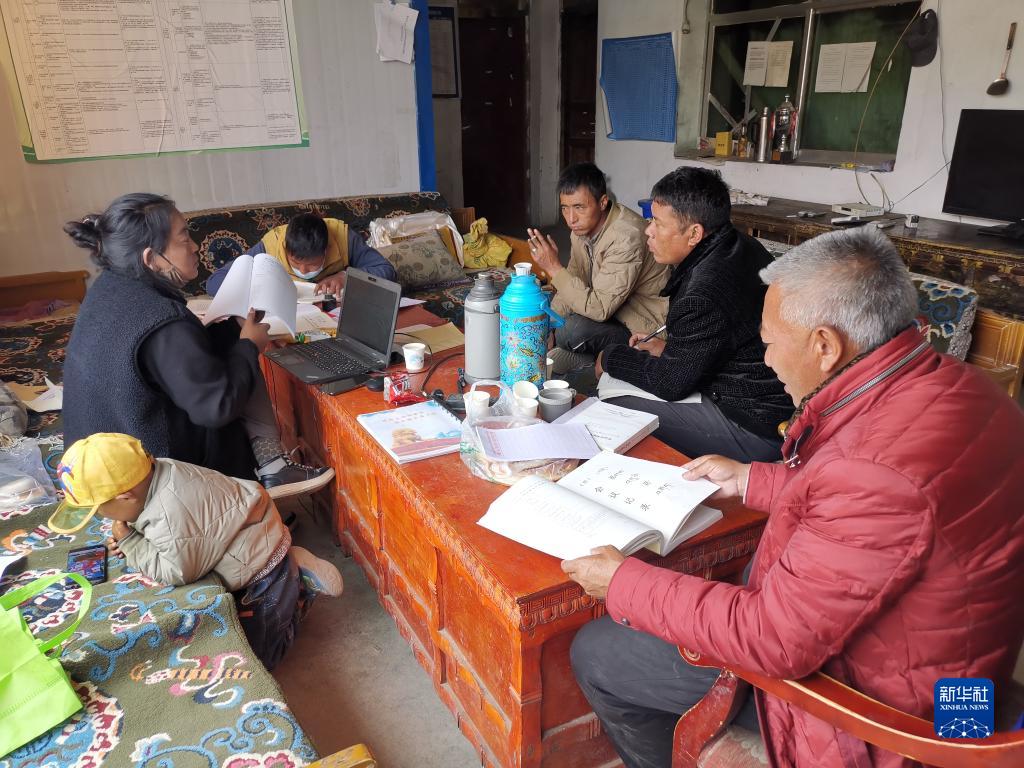 在特布拉村,駐村第一書(shū)記吉宗(女,左一)正與其他村干部開(kāi)會(huì),商討農(nóng)村廁所改造事宜。新華社記者 林建楊 攝(手機(jī)照片,4月16日攝)