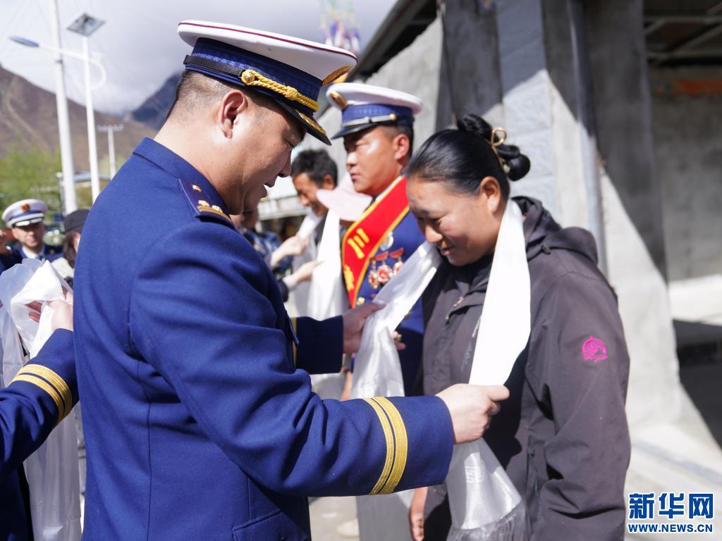 西藏林芝市森林消防支隊(duì)支隊(duì)長(zhǎng)楊飛向洛桑頓珠家屬敬獻(xiàn)哈達(dá)(4月15日攝)。(李國(guó)燾攝 新華網(wǎng)發(fā))