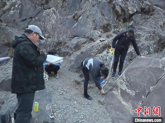 圖為日喀則石刻藝術博物館工作人員測量巖畫尺寸。日喀則石刻藝術博物館供圖