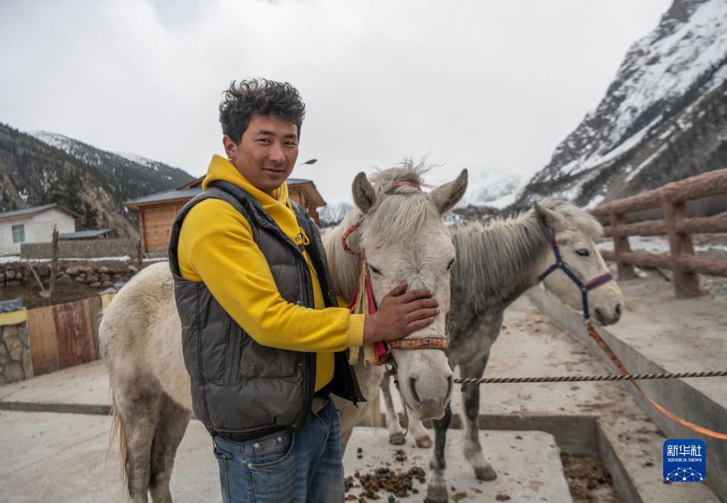 “慢慢來,別摔了。”28歲的江阿羅布把一名游客扶上馬,帶他前往離村不遠的米堆冰川參觀。