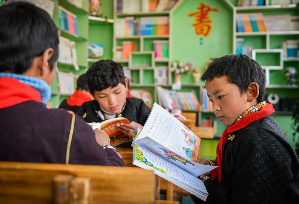 西藏林芝市工布江達(dá)縣仲莎鄉(xiāng)中心小學(xué)低年級學(xué)生在校圖書室內(nèi)閱覽書籍(2018年4月攝)。新華社發(fā)