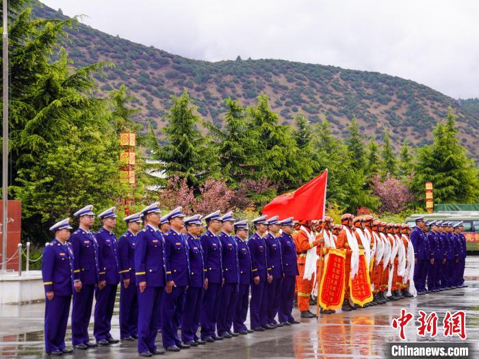 林芝市森林消防支隊(duì)營區(qū)人員列隊(duì)歡迎駐防分隊(duì)歸來。李國燾 攝