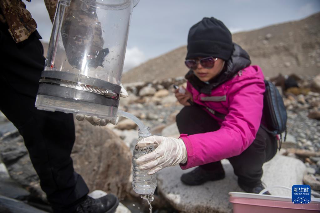 在東絨布冰川區(qū)域,科研人員進行微生物指標水樣采集(4月30日攝)。新華社記者 旦增尼瑪曲珠 攝