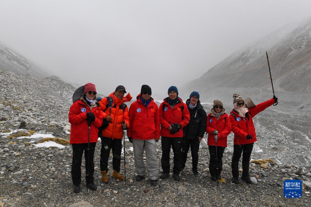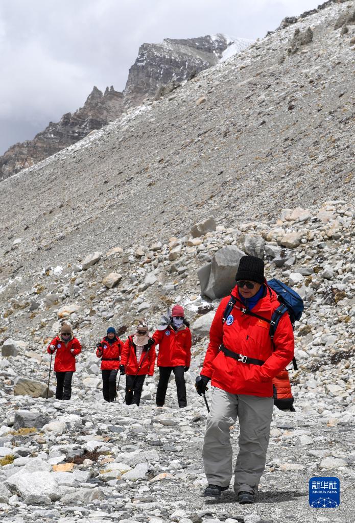 朱彤院士(左三)率領(lǐng)隊(duì)伍在絨布冰川附近進(jìn)行拉練。(2022年5月1日攝)新華社記者姜帆 攝