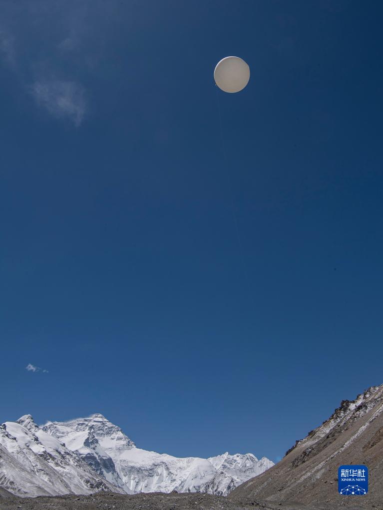 這是在珠峰登山大本營,科研人員施放的大氣臭氧探空氣球(5月3日攝)。新華社記者 孫非 攝
