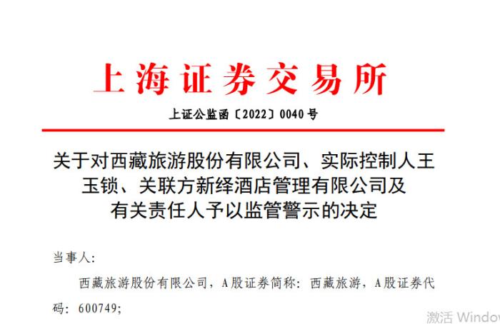 據(jù)上交所7日消息,因涉及非經(jīng)營性資金占用,且相關(guān)信息披露不真實、不準確等,上交所決定對西藏旅游股份有限公司、實際控制人王玉鎖、關(guān)聯(lián)方新繹酒店管理有限公司及有關(guān)責(zé)任人予以監(jiān)管警示。