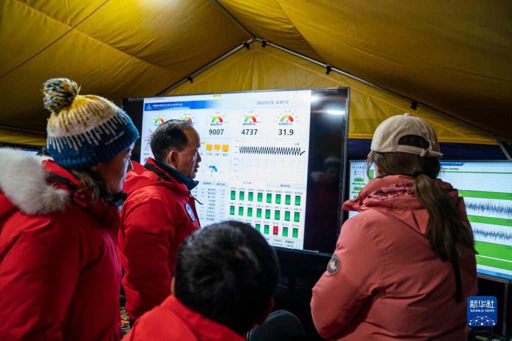 中科院院士、第二次青藏高原綜合科學(xué)考察研究隊(duì)隊(duì)長(zhǎng)姚檀棟(左二)查看觀測(cè)儀器數(shù)據(jù)(5月15日 攝)。新華社記者 孫非 攝
