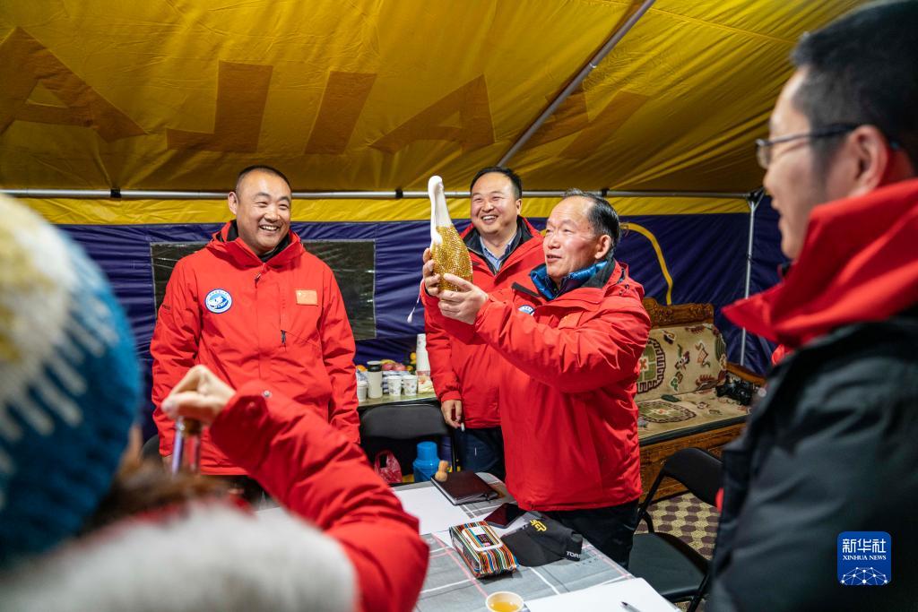 浮空艇創(chuàng)造紀(jì)錄后,科考隊(duì)員開(kāi)香檳慶祝(5月15日 攝)。新華社記者 孫非 攝