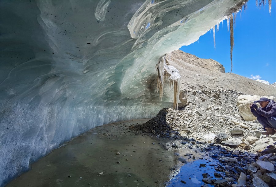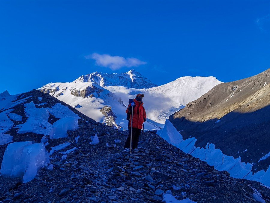 冰川與污染物小組在東絨布冰川觀察測量(5月6日攝,手機(jī)照片)。新華社發(fā)(受訪者供圖)