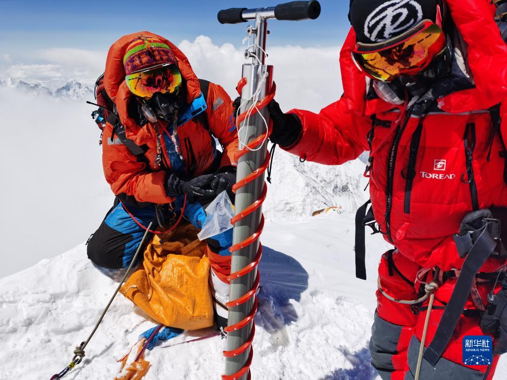 5月4日,德慶歐珠帶領(lǐng)的登頂小組科考隊(duì)員,在珠峰海拔8830米處架設(shè)世界海拔最高自動氣象站,建成珠峰梯度氣象觀測體系;在峰頂首次利用高精度雷達(dá)測量冰雪厚度,并采集了峰頂冰雪樣品。
