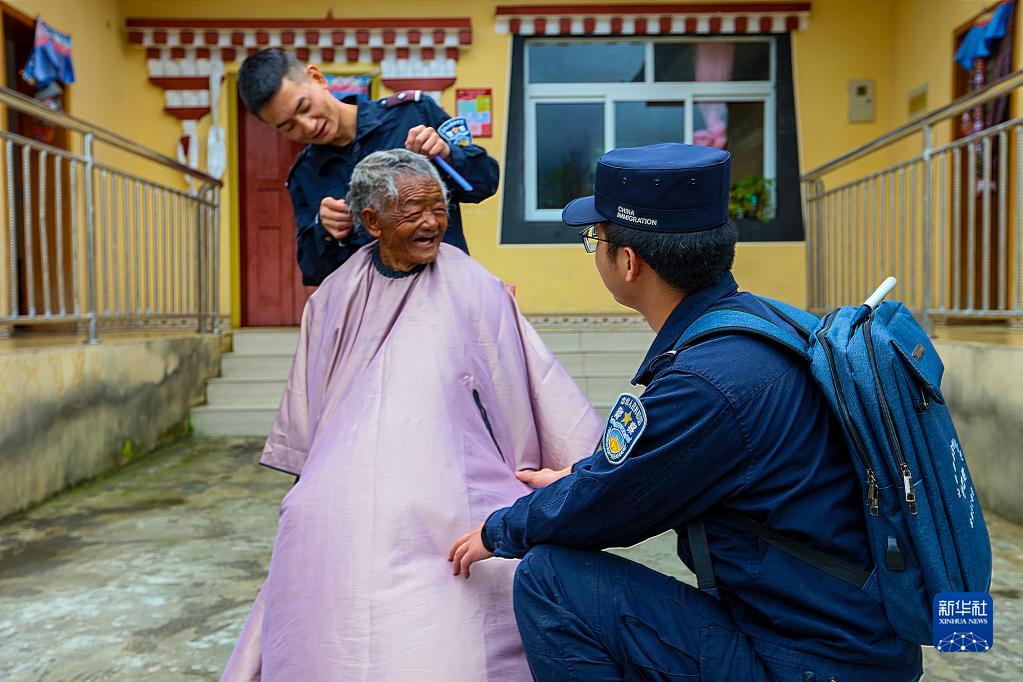 “阿嗚(察隅縣方言、老者的尊稱(chēng)),扎扎(理發(fā))!”定期走訪中,“背包民警”除了給竹巴村孤寡老人多多送生活必需品,還為他理發(fā)。“老人耳朵不太好,剪頭發(fā)時(shí)經(jīng)常動(dòng)來(lái)動(dòng)去,我們就耐心陪老人聊天,現(xiàn)在越來(lái)越熟了還經(jīng)常聊家常?!泵窬娋S說(shuō)。