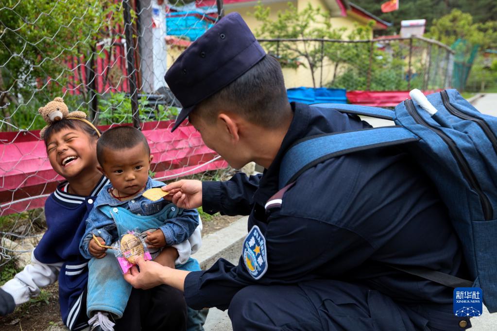 上察隅邊境派出所“背包民警”在走訪中給路邊的小朋友送零食(受訪者供圖)。