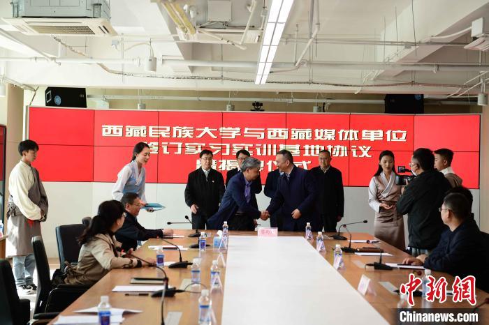 圖為簽約儀式上媒體單位負(fù)責(zé)人跟西藏民族大學(xué)的實(shí)習(xí)生合影?!∝暩聛硭?攝