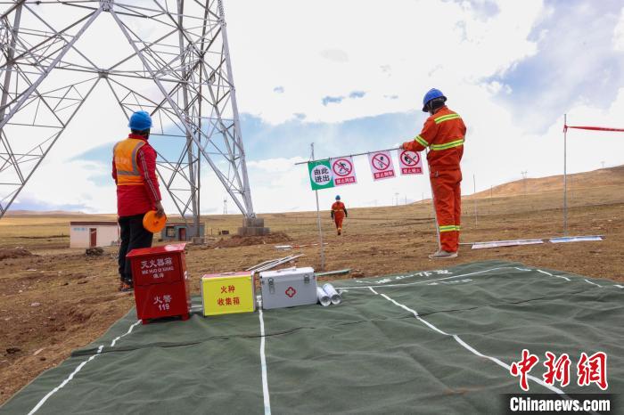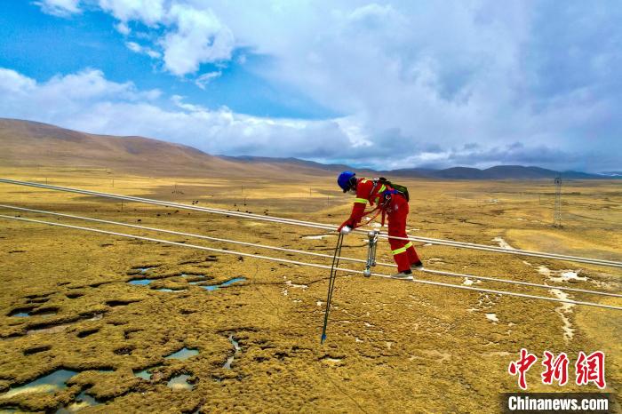 青藏聯(lián)網(wǎng)工程年檢工作人員正在進(jìn)行走線。 閆昱翰 攝