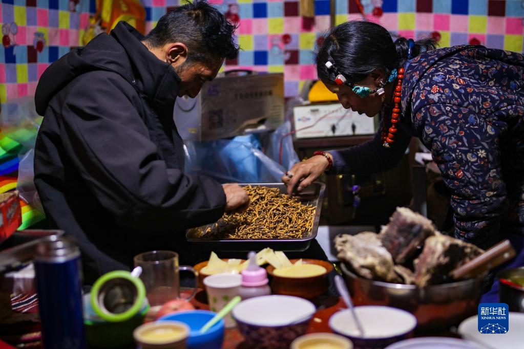 在西藏那曲市比如縣良曲鄉(xiāng)然木塘村蟲草采集點,一家人在整理幾天來采集的蟲草(5月25日攝)。新華社記者 姜帆 攝
