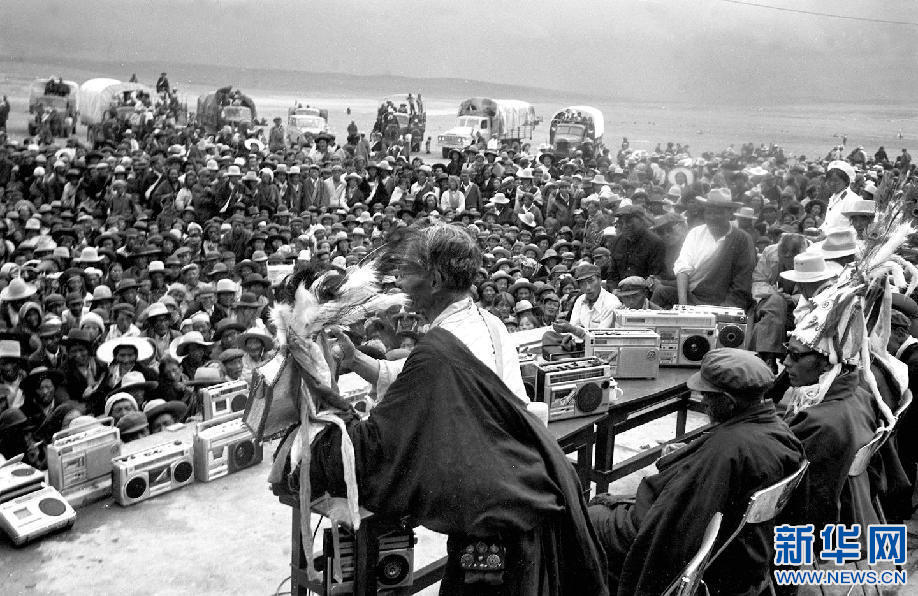 西藏那曲縣78歲的民間藝人阿達(dá)向觀眾說唱《格薩爾王傳》。新華社記者 馬競秋 攝(1986年1月15日發(fā))