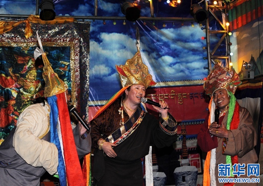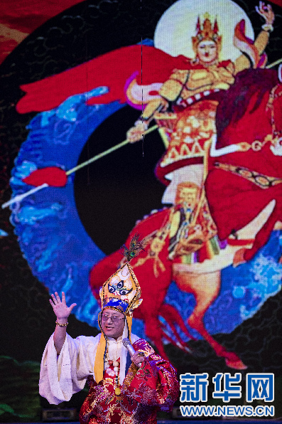 2015年12月30日晚,在拉薩舉行的西藏自治區(qū)2016年《吉祥彩虹》新年音樂會上,演員表演格薩爾說唱。新華社記者 晉美多吉攝