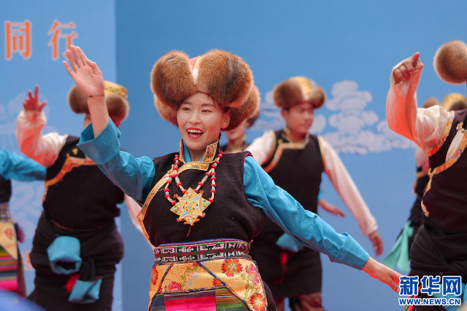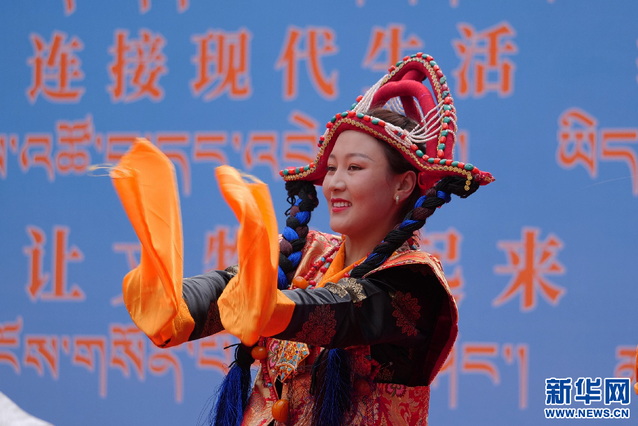 6月11日,西藏山南市貢嘎縣吉瓊村文藝演出隊(duì)在表演舞蹈《羊卓阿諧》。新華網(wǎng) 旦增努布攝