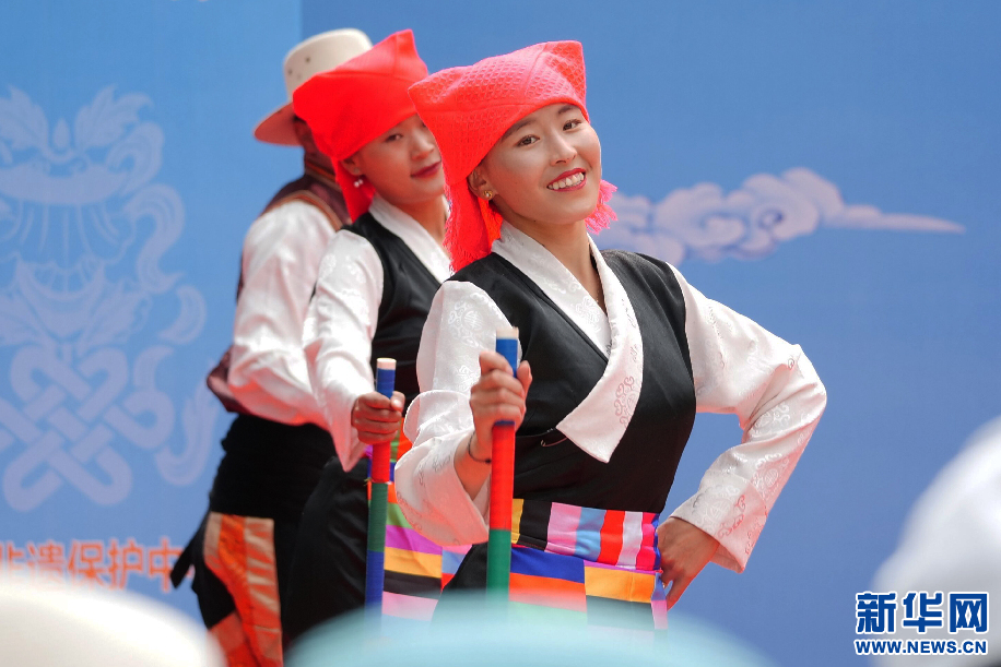 6月11日,拉薩堆諧市級(jí)代表性傳承人尼瑪倉(cāng)覺(jué)(右)和旺青(左)在表演堆諧《松則亞拉》。新華網(wǎng) 旦增努布攝