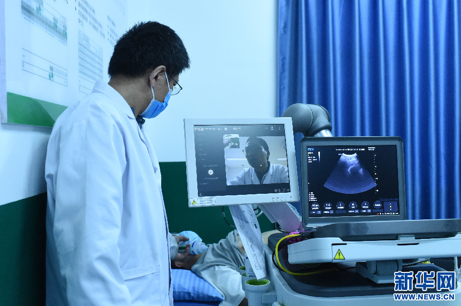 圖為醫(yī)生通過5G遠程超聲診斷的形式進行會診(6月20日攝)。新華網(wǎng)旦增努布 攝