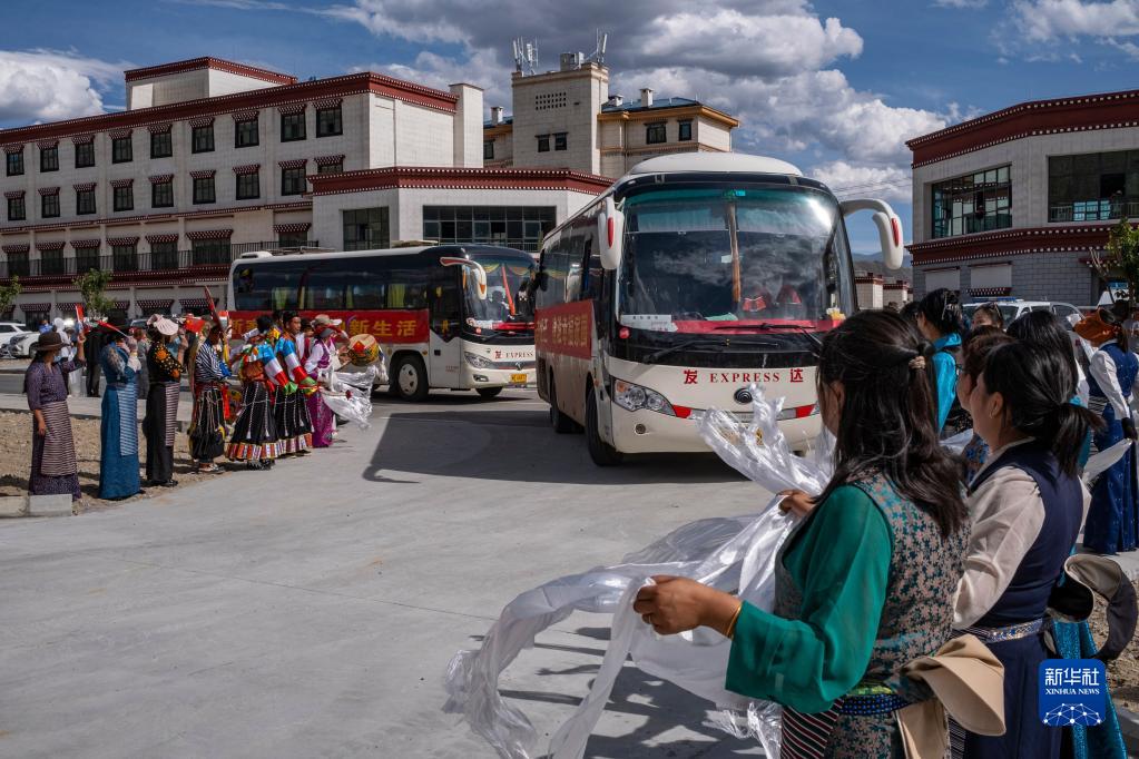 一陣陣激昂的藏戲鼓聲、一聲聲“歡迎到家”的美好祝福,當?shù)厝罕娛峙e象征五谷豐登的“切瑪盒”,逐一獻上哈達,迎接新鄰居。