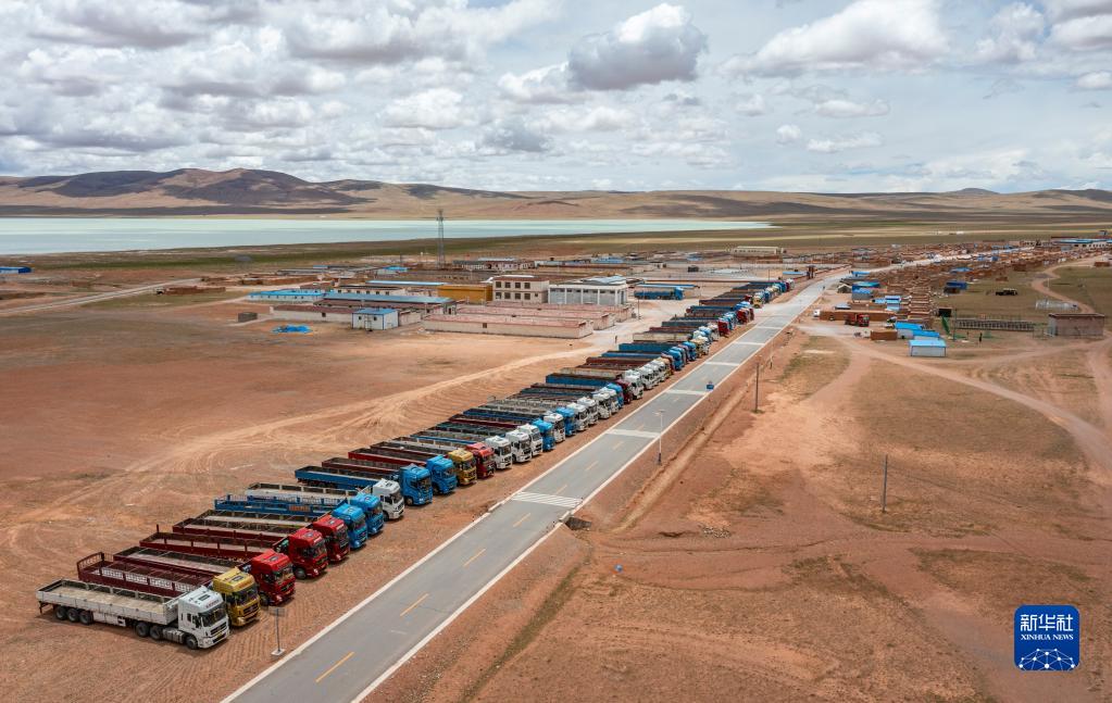 在雙湖縣多瑪鄉(xiāng)拍攝的負責運送搬遷群眾家具的貨車(7月12日攝,無人機照片)。新華社記者 孫非 攝