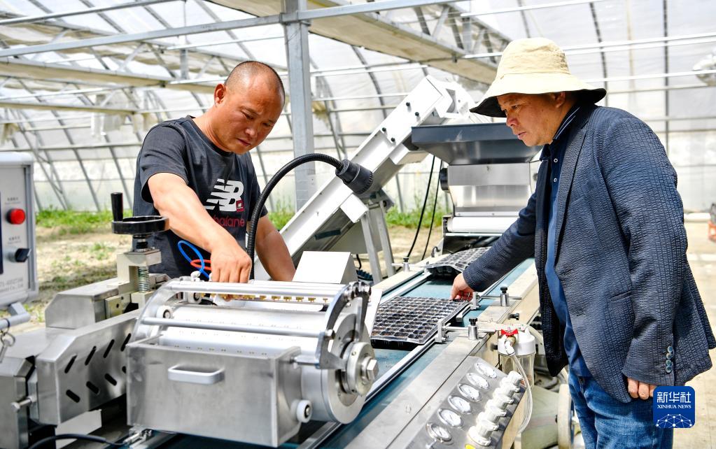 7月11日,在瓊結(jié)縣千畝蔬菜基地育苗大棚內(nèi),基地負責(zé)人管大鵬(右)和技術(shù)人員正在調(diào)試播種流水線。新華社記者 張汝鋒 攝