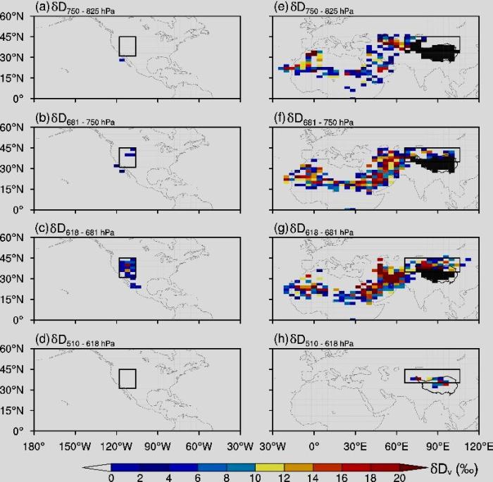 夏季美國西部和亞洲干旱區(qū)不同層水汽穩(wěn)定同位素的“反高程效應(yīng)”的空間分布格局?!≈锌圃呵嗖馗咴?供圖