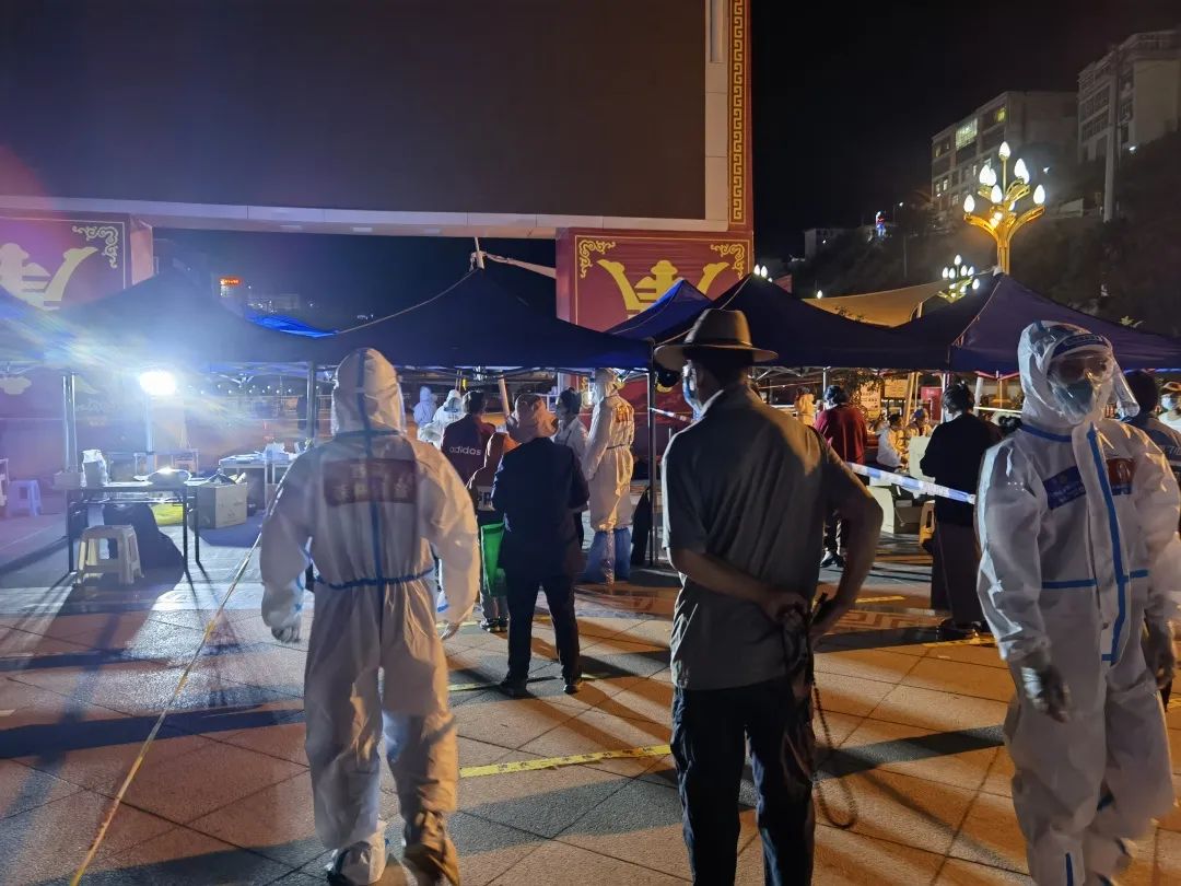 “為了您的安全,請(qǐng)保持1米以上間隔,謝謝?!蓖砩?點(diǎn)多,在茶馬廣場(chǎng),支隊(duì)三級(jí)消防士張興梁,依然堅(jiān)守在抗疫一線,維持著排隊(duì)做核酸的長(zhǎng)隊(duì)。從早上7點(diǎn)開始,張興梁和其他消防隊(duì)員已堅(jiān)守了14個(gè)多小時(shí)?!拔鞑貢円箿夭钐卮?,白天防護(hù)服里面衣服都濕透了,但是到晚上這個(gè)點(diǎn)已經(jīng)干了,正好不用換衣服了。”張興梁打趣的說到。