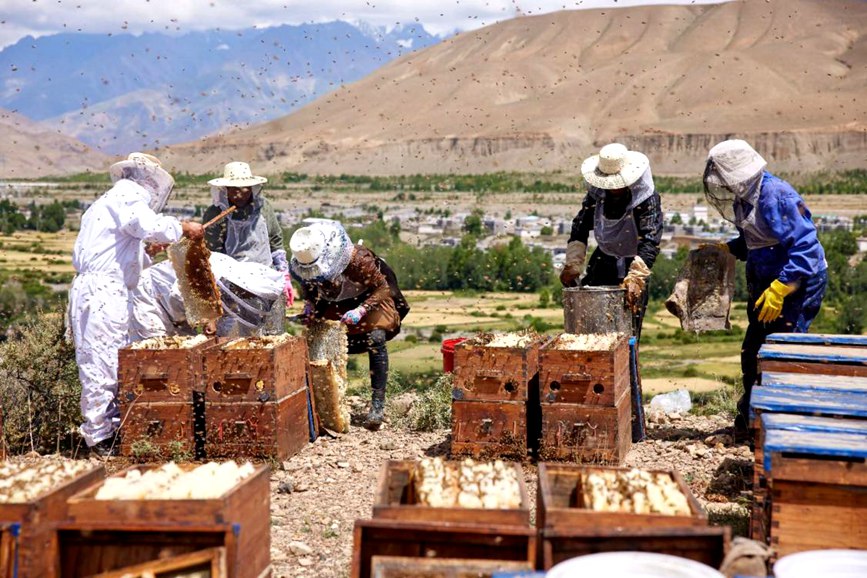 經(jīng)過(guò)幾年努力,來(lái)自貴州的養(yǎng)蜂人張亮富在山南市建起了一座蜜蜂文化主題生態(tài)體驗(yàn)園,為當(dāng)?shù)匕傩諑?lái)了“甜蜜”。今年,他與當(dāng)?shù)?個(gè)縣開(kāi)展蜜蜂養(yǎng)殖合作,投放蜜蜂2100余箱,建成64個(gè)養(yǎng)蜂點(diǎn),預(yù)計(jì)年產(chǎn)值3200萬(wàn)元。“老百姓在家就可以完成蜜蜂養(yǎng)殖,更能安心守護(hù)家園?!睆埩粮徽f(shuō)。