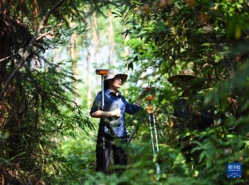 9月22日,白拉曲珍和同事在位于廣東韶關(guān)樂昌市張溪村的生態(tài)監(jiān)測樣地工作。新華社記者 鄧華 攝