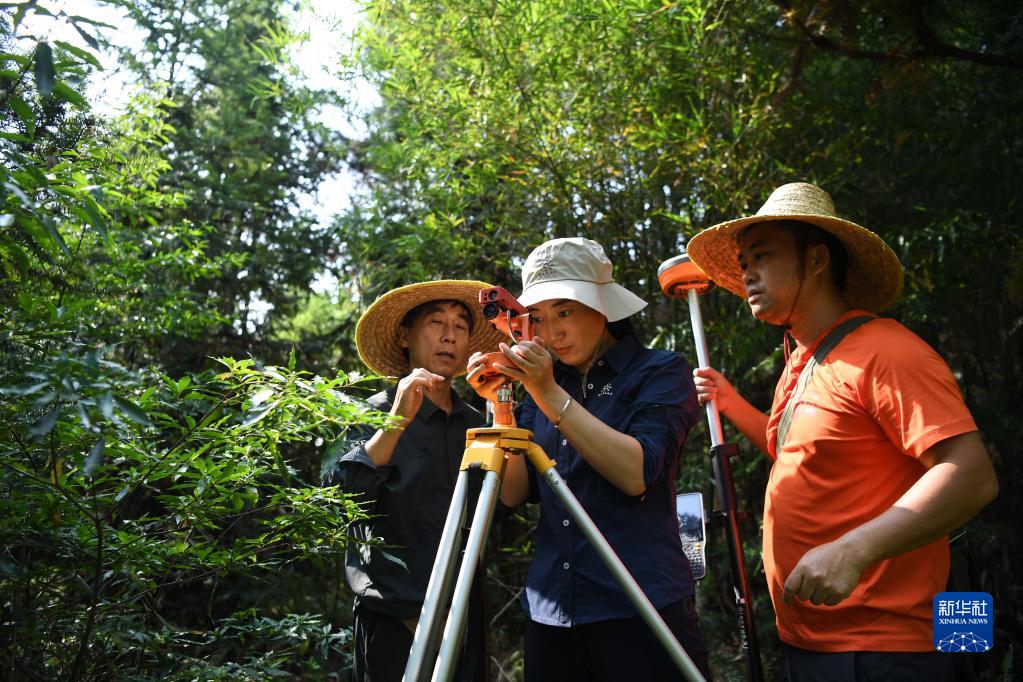9月22日,在廣東韶關(guān)樂昌市張溪村的生態(tài)監(jiān)測樣地,白拉曲珍(中)和師傅江建發(fā)(左)、同事伍國清在操作設(shè)備。新華社記者 鄧華 攝