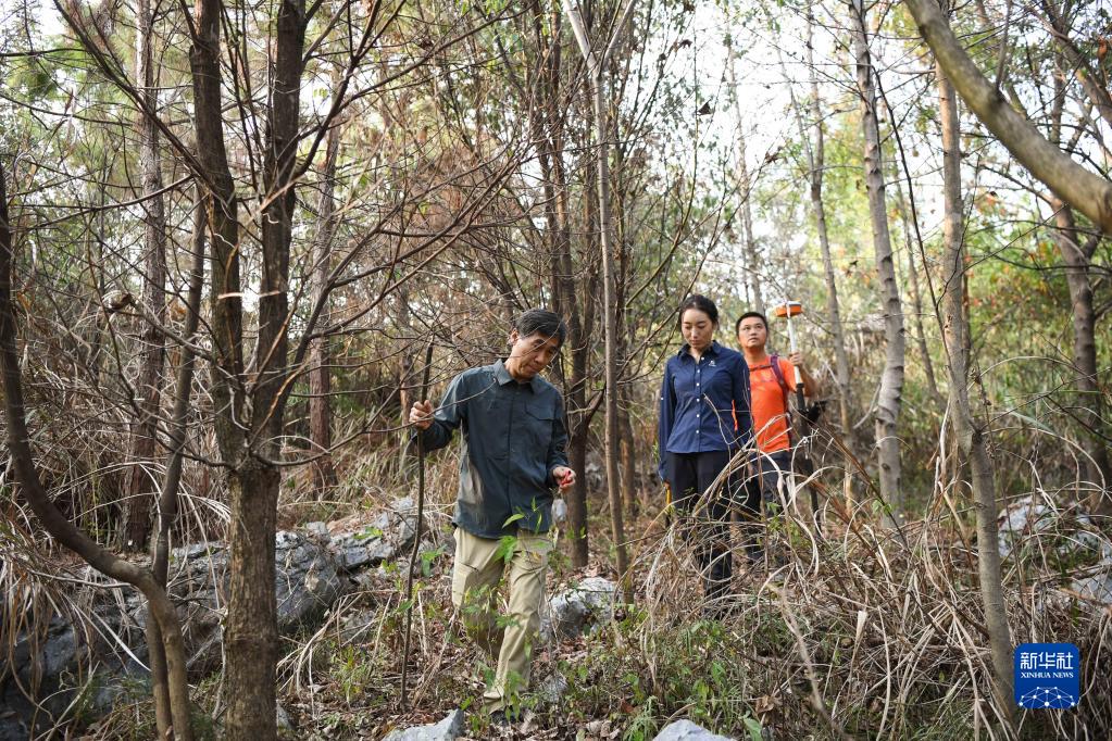 9月21日,在廣東韶關(guān)樂昌市秀水鎮(zhèn)大羅嶺村,白拉曲珍(中)和師傅江建發(fā)(前)、同事伍國清在石漠化生態(tài)恢復(fù)監(jiān)測平臺固定樣地工作。新華社記者 鄧華 攝