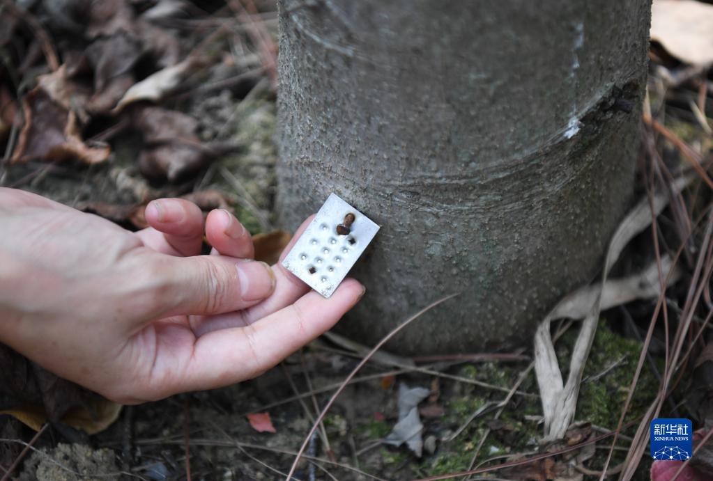 9月21日,在廣東韶關(guān)樂昌市秀水鎮(zhèn)大羅嶺村,白拉曲珍在石漠化生態(tài)恢復(fù)監(jiān)測平臺固定樣地查看樹木標(biāo)牌。新華社記者 鄧華 攝