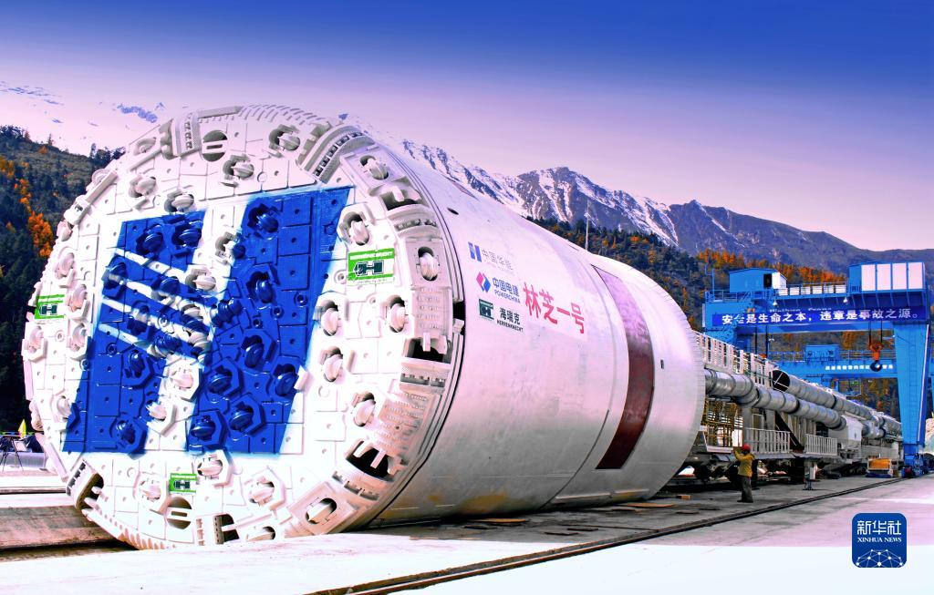 派墨公路多雄拉隧道施工采用的“林芝一號”全斷面雙護(hù)盾硬巖掘進(jìn)機(TBM)完成組裝并順利進(jìn)行首次滑行(2015年10月29日攝)。新華社發(fā)(董志雄 攝)