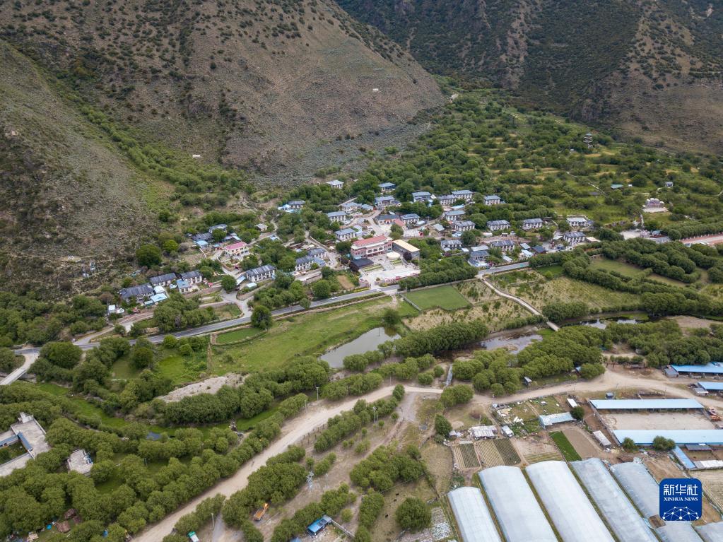 村口路邊墻壁上“綠水青山就是金山銀山”紅色大字十分醒目。再往里走,道路平坦整潔,四處花紅葉綠。藍(lán)天白云下,一棟棟藏式民居掩映于蒼翠群山間,漫山遍野的野生桃林令人心曠神怡。